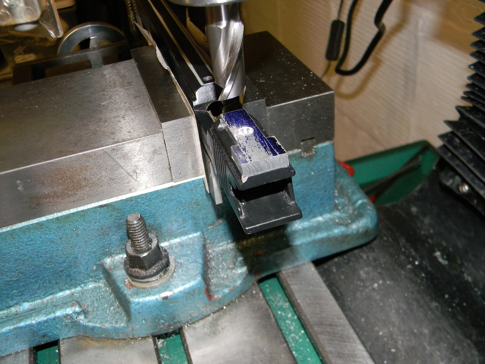 With the piece on parallels to get it above the top of the vise jaws, I started by milling off the front sight. It would be a straightforward project to make a new--better--front sight for this pistol, as the original cast sight with the rounded edges left a lot to be desired.