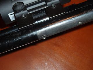 A quick detour. This picture of a 112 wearing a red dot is probably enough to get me banned for life from any and all vintage airgun forums. Nick, are you crying? Well, in case anyone is still reading, that's a Tasco RedDot model BKRD3022. It's got a .22 dovetail base. The rings are current Crosman production MT459 intermount rings for the 22XX guns. Do they fit the old gun? Yep. Perfectly.