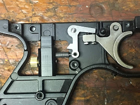 With the frame prepped, I could start assembling the two stage parts. For a list of the necessary parts I went to Crosman's site and download the EVP for the Crosman 1701P pistol. I called Crosman with the part numbers and ordered everything on the grip frame schematic that I didn't have.